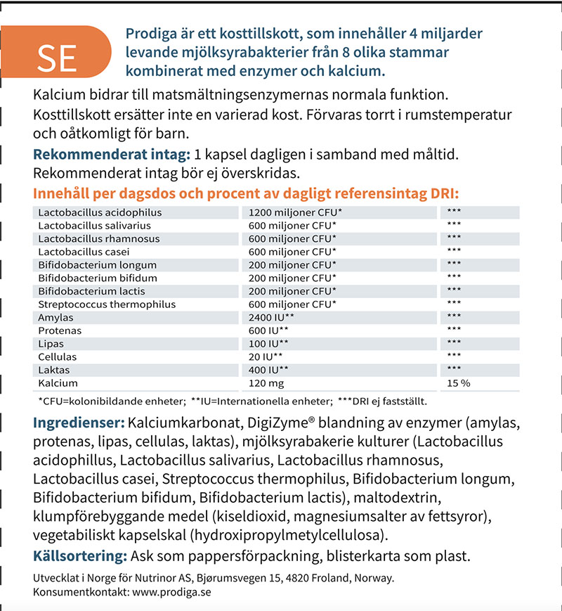 Alla ingredienser i Prodiga har genomgått grundliga tester och bedöms som säkra av livsmedelsverket. Den dagliga dosen bör inte överskridas. Prodiga har inga biverkningar, och produkten anses vara säker. Som med alla andra probiotiska produkter kan du under de första dagarna uppleva en tillfällig ökning av gasbildning och uppblåsthet. Detta är normalt när kroppens system anpassar sig till produkten.